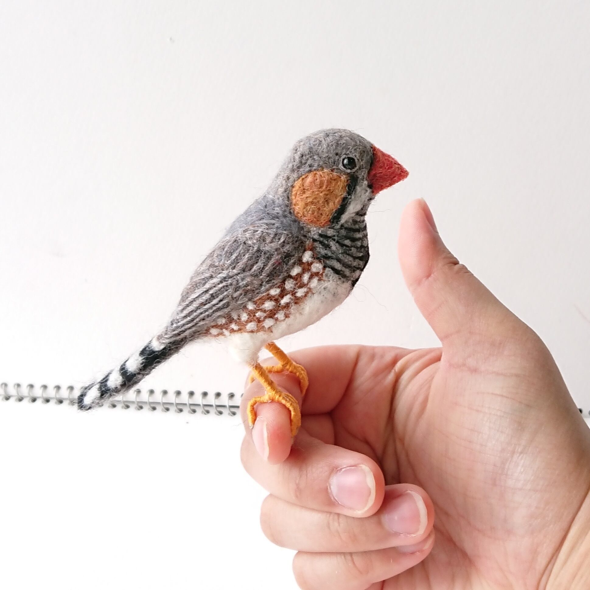 羊毛フェルトで制作したキンカチョウのマスコットです。足に針金を使用しているので指に掴まらせることが出来ます。