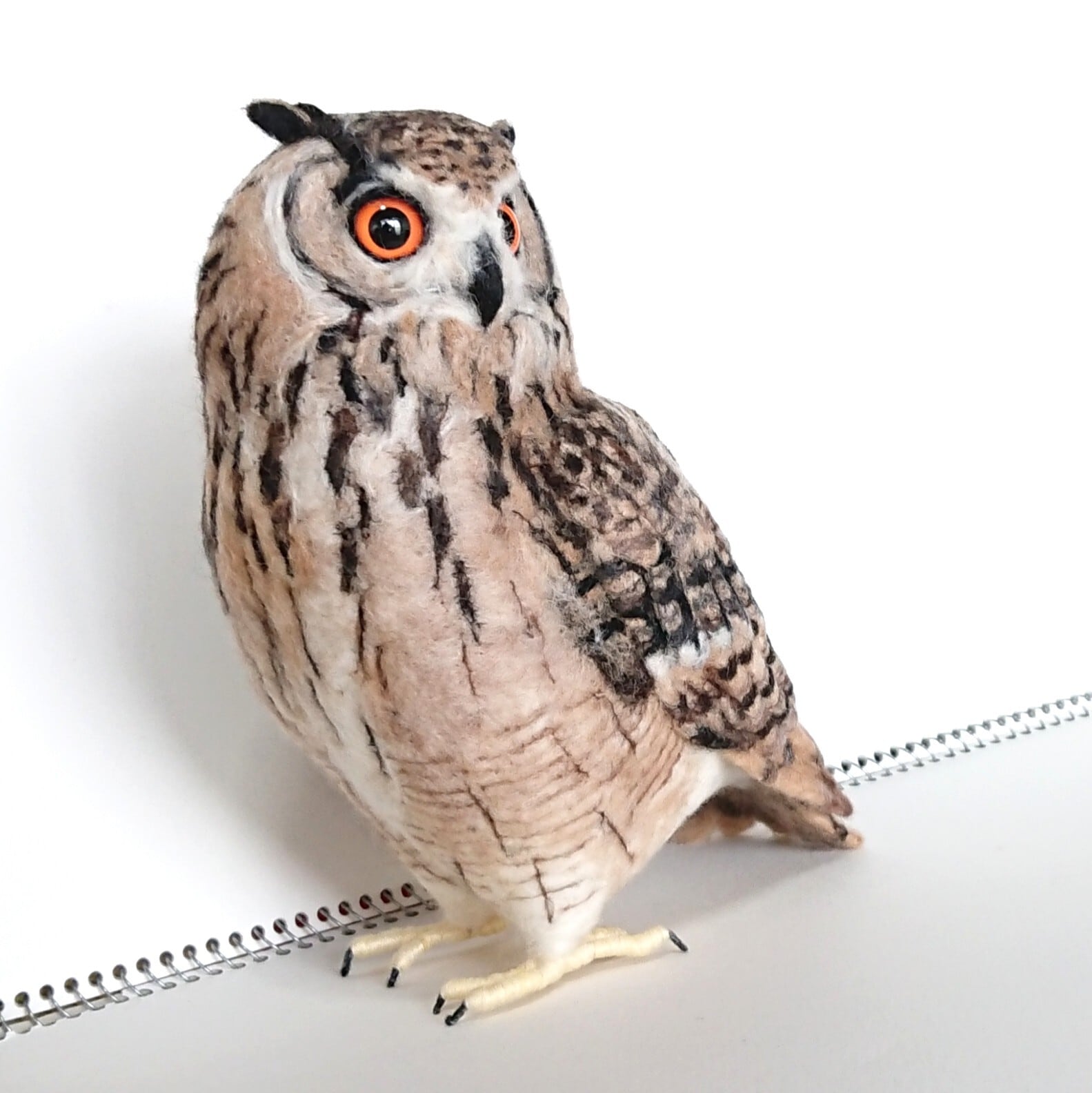 羊毛フェルトで制作したベンガルワシミミズクのマスコットです。足に針金を使用しています。