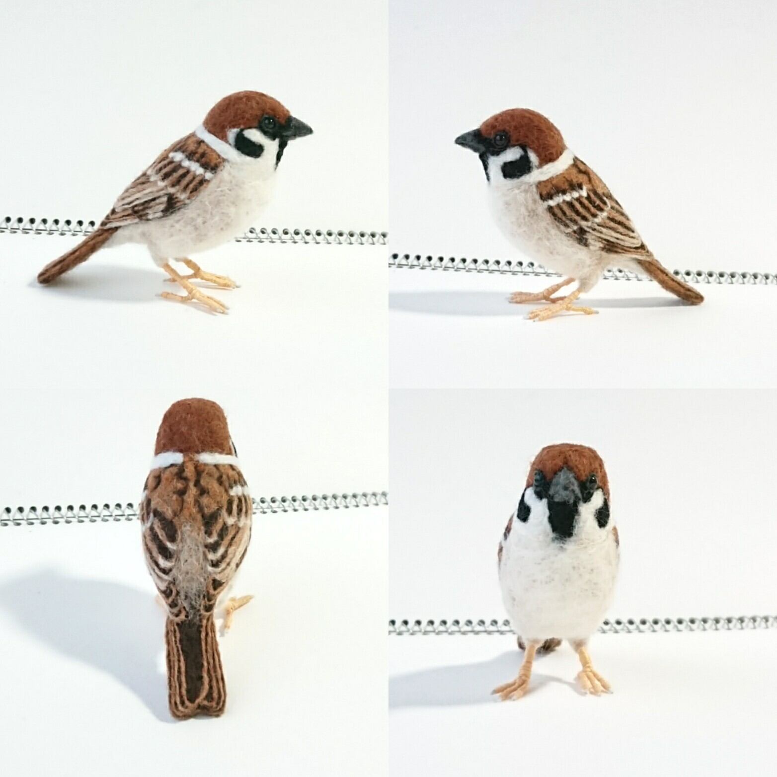 羊毛フェルトで制作したすずめのマスコットです。足に針金を使用しているので指に掴まらせることが出来ます。