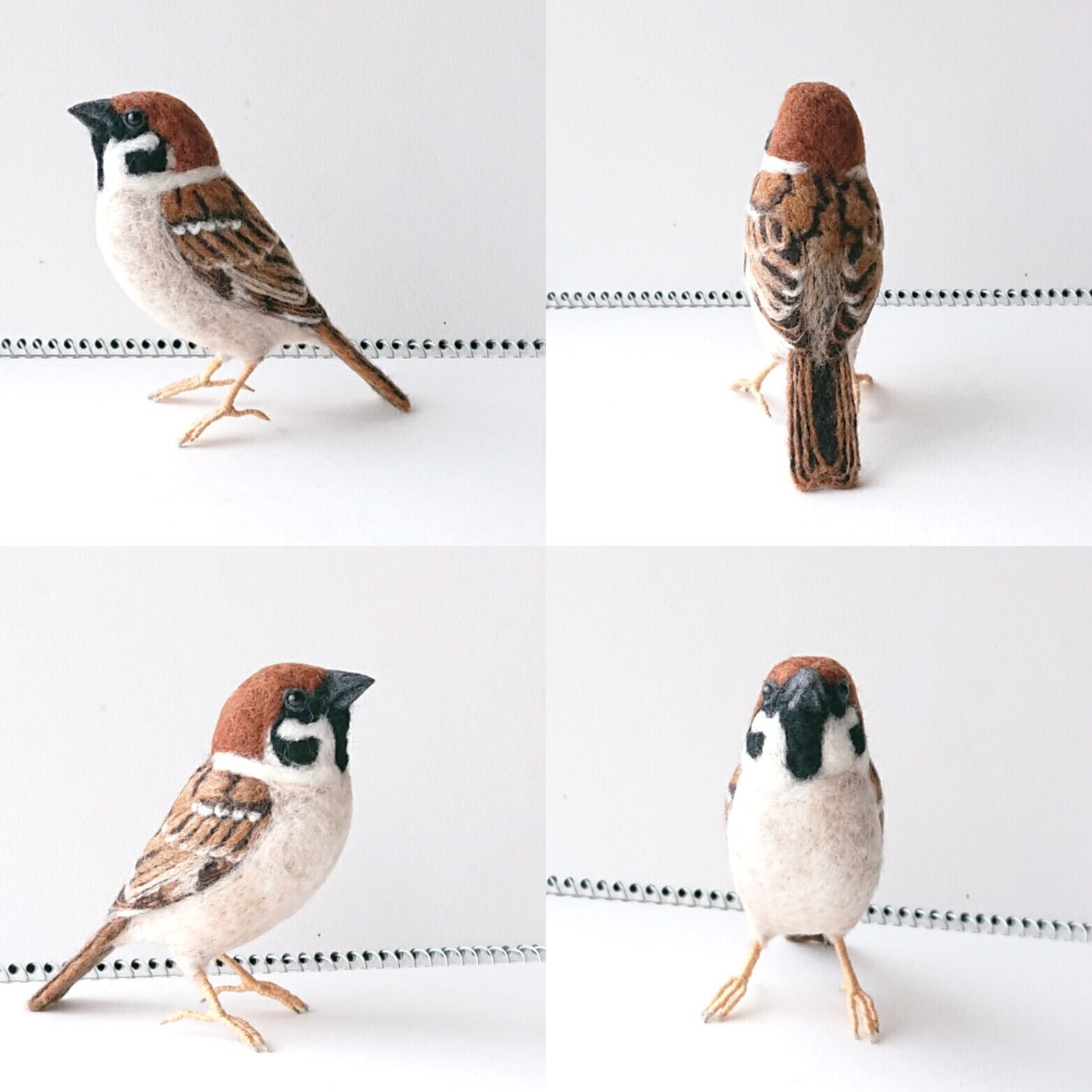羊毛フェルトで制作したすずめのマスコットです。足に針金を使用しているので指に掴まらせることが出来ます。