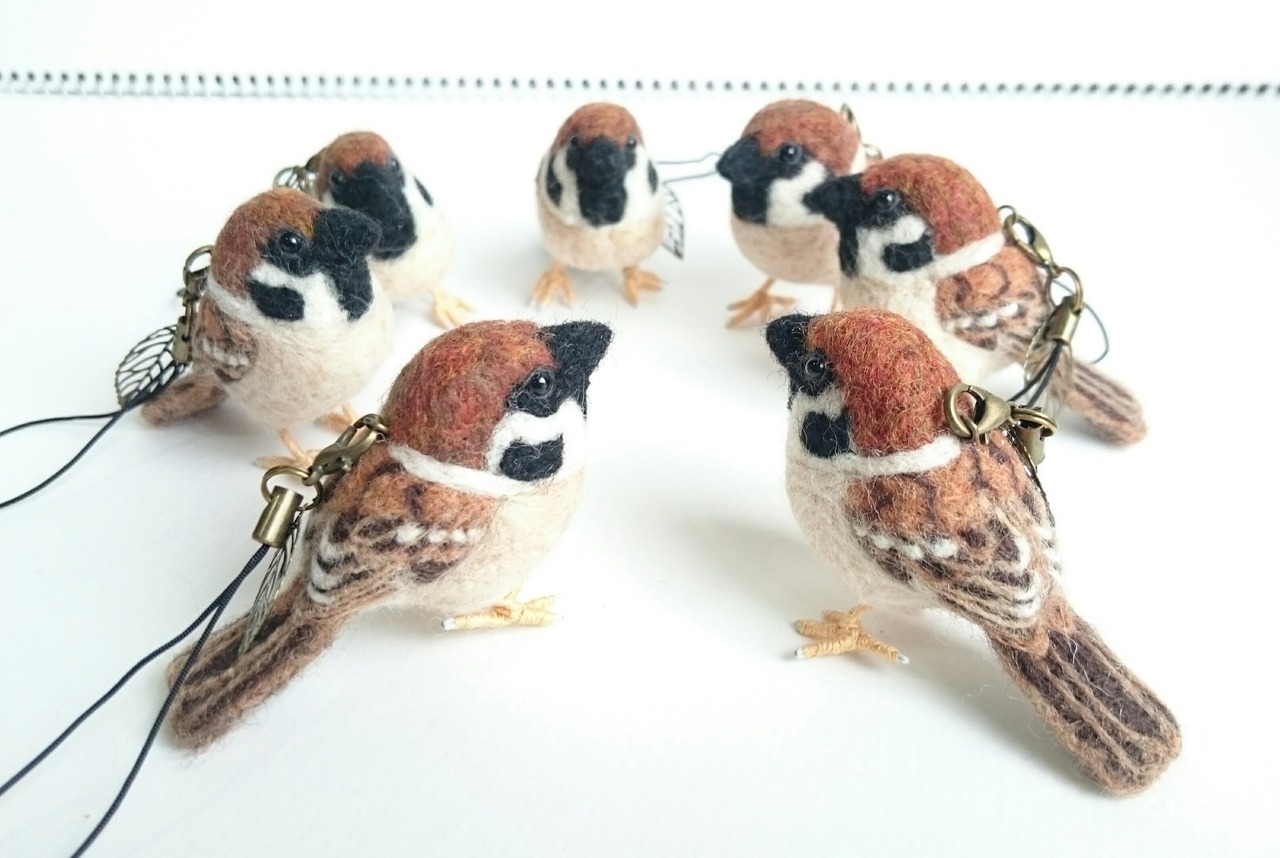 細い子も太い子もいるすずめの小さなストラップです。こちらは参加出来なくなったデザフェスvol.45の28日の分の子達です。1羽につきおひとつ、画像の缶バッチがつきます。(絵柄はランダム)
