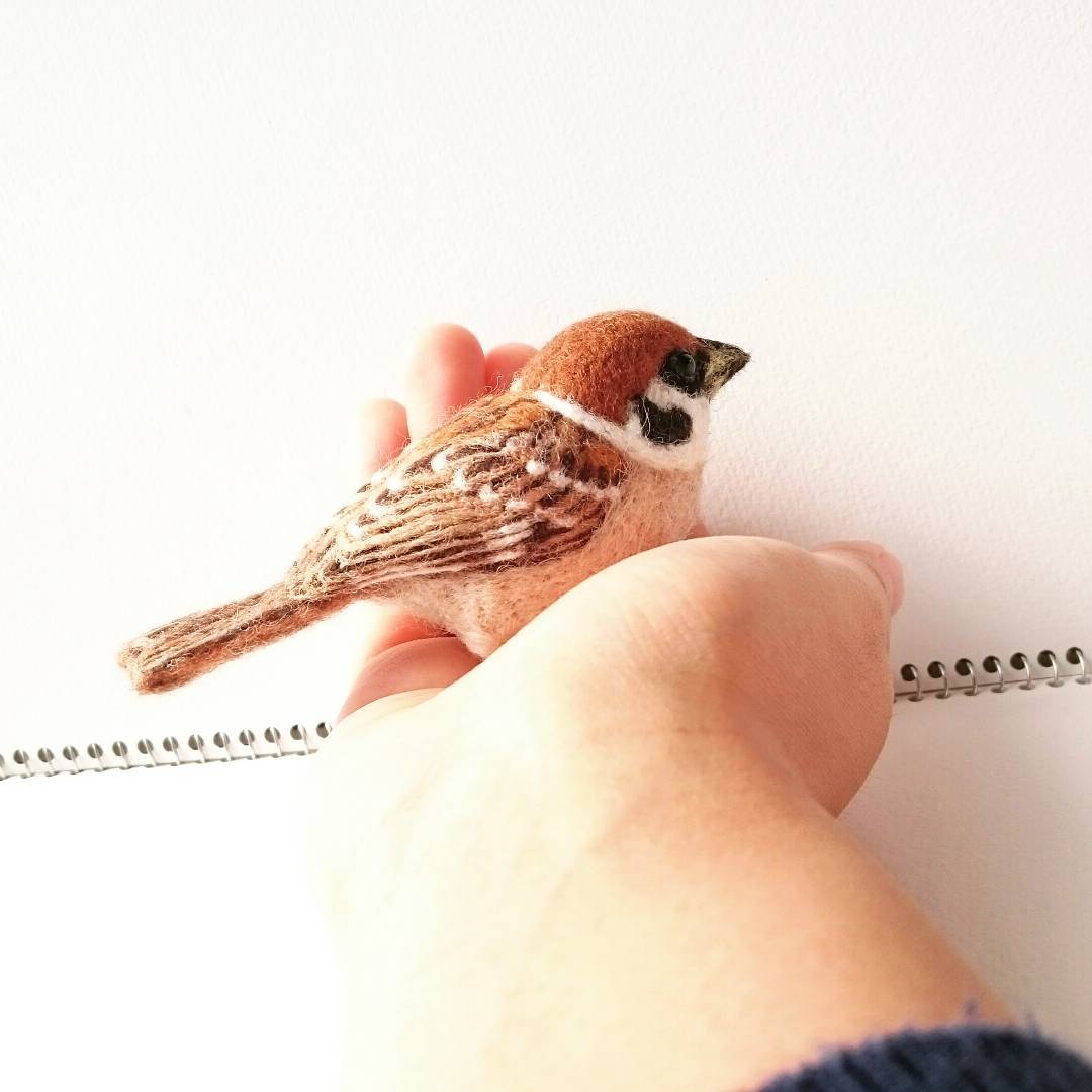 羊毛フェルトで製作した指にとまれる大きいすずめのマスコットです。